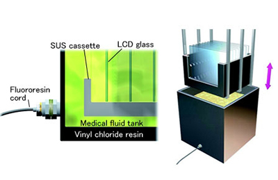 This application uses a Proximity Sensor with a fluororesin casing.Detect only SUS cassettes through the vinyl chloride resin of a tank to enable detecting the position of cassettes immersed in a liquid chemical in the tank. This Sensor uses a fluororesin with resistance to chemicals to enable applications in harsh environments where liquid chemicals are sprayed.